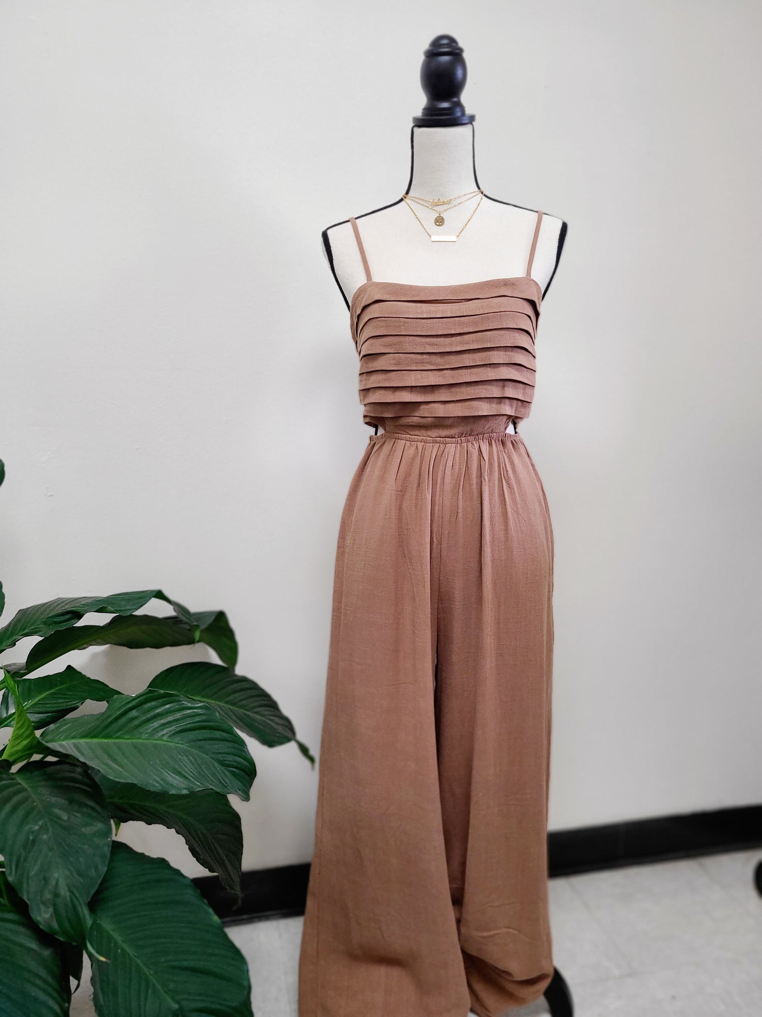 Pleated bodice with side cutouts, pockets, and wide leg pants